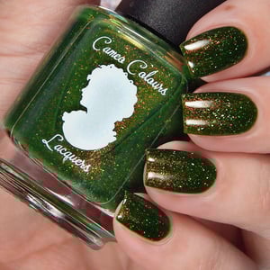 A deepened green, with a red/gold/green shifting shimmer and holo micro flakes.